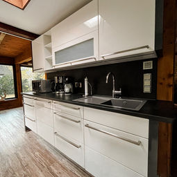 6 Personen. Es gibt einen großen Wohn- und Essbereich mit einer offenen Küche, einem Kamin mit integrierter Leseecke.